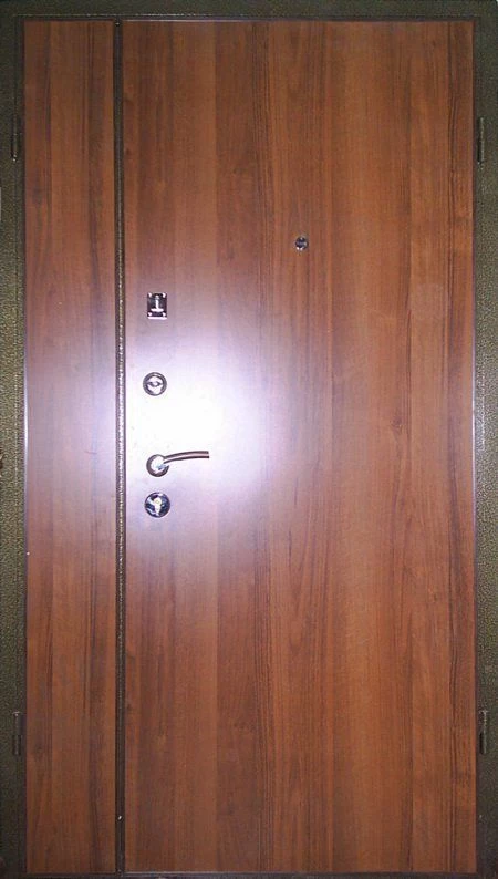 Ламинат - это доска из ДВП толщиной 4-5 мм с четырехслойным покрытием. Визуально он не отличается от натуральной древесины. Рисунок ламинированной доски может быть гладким и имитировать древесный спил или рельефным, имитирующим структуру дерева. Разнообразная цветовая гамма этого материала позволяет изготовить дверь, которая будет отлично смотреться в интерьере как квартиры, так и офиса.