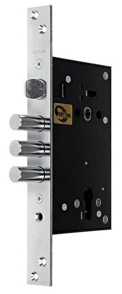 Корпус врезного цилиндрового замка ЗВ4 713.0.0 подходит для установки во входные двери жилых и общественных зданий. Модель рекомендована для установки в противопожарные двери. Замок запирает дверь на три оборота тремя ригелями диаметром 16 мм, которые выдвигаются из корпуса замка на 36 мм. Один из ригелей оснащен закаленным скользящим стержнем, что является хорошей защитой от перепиливания. Корпус повышенной жесткости усилен втулками, что позволяет крепить броненакладку. Съемная лицевая планка дает возможность устанавливать замок как вкладной. Оснащен усиленным фиксатором ригельной планки. Замок имеет защелку. Корпус замка изготовлен из стали, покрытие - порошковая краска. Ригели изготовлены из стали, покрытие - никель/хром. Бэксет: 66,5 мм. Межосевое расстояние: 85 мм. При продаже замок комплектуется винтом М5Х70 для крепления цилиндрового механизма. Корпус замка сертифицирован в соответствии с 4-м, самым высоким классом безопасности по ГОСТ. Для соответствия классу замок необходимо эксплуатировать с цилиндровым механизмом 3-го, 4-го классов ГОСТ, а также с броненакладкой.